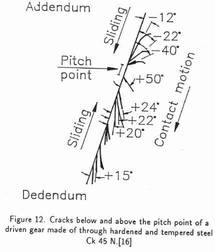 The angles of 12 - 32° on the left side of Figures 9 and 10 agree well with the angles 10 - 30° observed on gear teeth. Figure 12 from Joachim [18] shows such cracks below and above the pitch point. Steeper cracks only occur very close to the pitch point. The coefficient of friction is higher there.[1] Steeper cracks agree with crack paths shown in Figures 7 and 8.