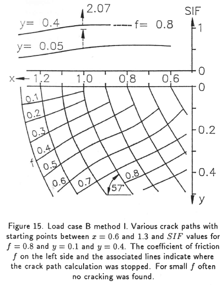 Agreement between the two methods was again quite good. Exceptions are the SIF values at y = 0.4 and the angles of the crack paths close to the loaded surface. This is due to the influence of shear (K11mode) which is taken into account by method II. However, the angles at a distance y = 0.5 from the surface are generally less than 53 - 58° with small deviations. With the estimated influence of bending the angles change to approximately 75° which is in good agreement with angles found in practice (Figure 3).