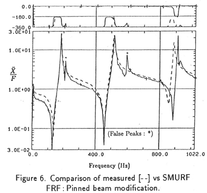 Noise was not as noticeable in the pin-type modifications and consequently the problem of mode omission did not arise. The major discrepancy between the predicted and measured results in these cases was the spurious peaks displayed by the SMURF FRFs. As has already been stated, these peaks corresponded to the original natural frequencies of the component systems and were not identified as modes during parameter estimation. It is postulated that the false peaks originated from numerical ill-conditioning at the frequency of the original resonant peaks. This ill-conditioning was amplified due to the lightly damped nature of the component structures and it is expected that the false peaks would decrease in magnitude if structures with higher damping were considered.