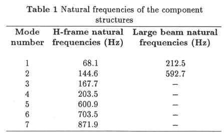 The natural frequencies of the components structures are shown in Table 1. Note that Table 1 shows only the natural frequencies for the H-frame and the larger of the two component beams, since the shorter beam did not exhibit any resonances in the examined frequency range.