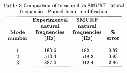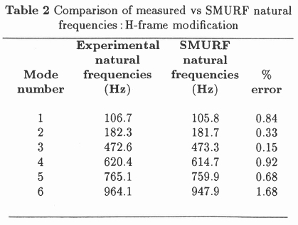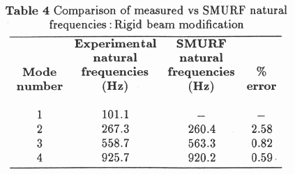 Time domain polyreference parameter estimation was performed on both the measured and SMURF FRFs, and natural frequencies and mode shapes were extracted. The extracted natural frequencies are shown in Tables 2, 3, and 4. It was found that the spurious peaks exhibited by the first two modification predictions were not identified as modes during parameter estimation. As can be seen, with the exception of the omitted mode in the rigid modification, tHe SMURF predictions compare favourably with the measured data. The extracted mode shapes for the SMURF and measured modifications were almost identical and hence are not shown.