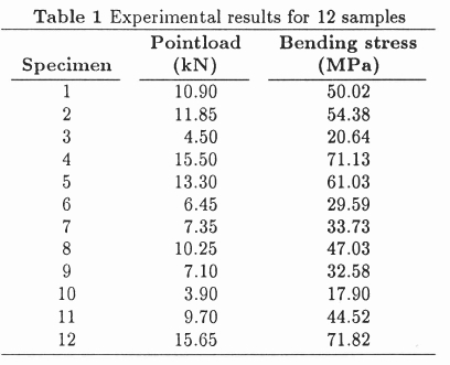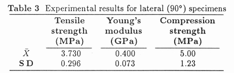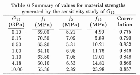 The last column in Table 6 lists the correlation attained by fitting the experimental failure results with the values in the previous three columns. An important conclusion is that the failure criterion used here is not very sensitive to variation of the shear modulus in the loading configuration considered, since a variation of 0.1 - 10.0 GPa in the shear modulus caused a variation of 70.5 - 55.36 MPa in the longitudinal fibre strength.