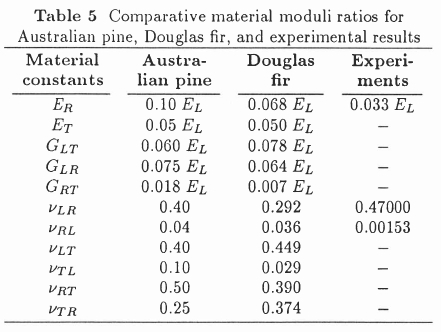 • The Young's modulus in the vertical direction is not constant for all planks cut from the same log, since the tangential and radial moduli differ. In Figure 1 the modulus in the vertical direction for plank 1 is the same as the radial modulus, whilst that for plank 4 is the same as the tangential modulus.