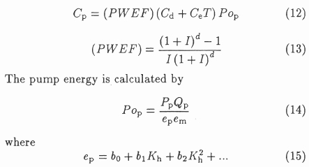 The operating cost of the network consists mainly of the energy cost (Cp) of the pumps. In present worth terms it can be presented as in Mathews & Köhler.[8]