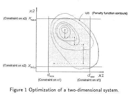 Let us first shift variable x1in the direction in which the penalty function L(x) decreases until a minimum is reached. After a minimum is reached, variable x2 is manipulated in a similar way. These two (x1and x2) are again manipulated until a local minimum is reached. Notice that the optimization process takes place in the shaded area formed by the constraints.