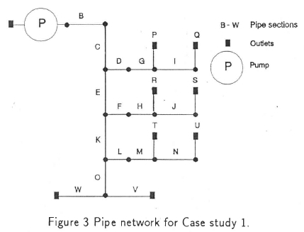 The network for the first case study is given in Figure 3. It consists of 14 interior pipes and 8 outlet pipes. Specifications for this case study are given in Table 1. Two calculations were performed. Firstly, the discrete pipe diameters were calculated that will satisfy the flow requirements but not necessarily minimize the life cycle cost of the network. Secondly, the pipe diameters were calculated that satisfy the flow constraints as well as minimize the life cycle cost. The results of these calculations are given in Table 2. The savings obtained by minimizing the life cycle cost for this study was 28% compared to when only the flow requirements were taken into account.