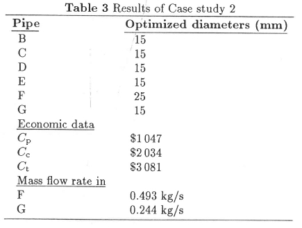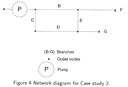 In this case a simple theoretical network with a single loop is examined. Although it is not an existing network against which we could compare the optimization results, it was chosen to show that networks with loops can be optimized. The required outlet flow rates in branches F and G are 0.5 kg/s and 0.25 kg/s, respectively. The other input data are the same as for the previous case study. Figure 4 shows a diagram representing the network. The results of Case study 2 are presented in Table 3.