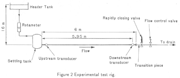 The pipes were 6 m long with two transducer pockets welded onto the outer wall at 50 mm from each end, and into which were screwed two 25 mm diameter inductance pressure transducers. The pockets were provided with air bleed holes for the release of any entrapped air prior to surge. Each Transducer pocket was connected to the fluid in the pipe via a 4 mm diameter hole 9 mm long, drilled through the pocket and pipe wall. Similar pockets had been used in similar experiments on circular pipes and had been found to give excellent results. The upstream end of the pipe was connected, via a flange, to a settling tank which was supplied with water from a 16 m high constant head tank through a rotameter used for measurement of the water flow rate. The rotameter was calibrated by weighing water collected over a period of time to generate a linear calibration curve. The error bound on the measurement of flow rate was ± 1%. Each pipe was clamped at intervals of 650 mm along its length to prevent longitudinal expansion (i.e. case (b) of Table 1), and also to reduce longitudinal and lateral vibration.