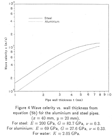 Sensitivity of the wave celerity to changes in pipe material is illustrated in Figure 4 where, for the aluminium pipe, the combinations of lower moduli of elasticity and shear coupled with a higher Poisson's ratio causes a substantial reduction in wave celerity.