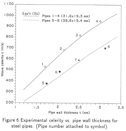 In Figure 3, for a given constant pipe size, equation (5b) shows an increase in wave celerity with wall thickness which gives good correlation to a logarithmic function of the form log(c) = (a) log(tf) over the range 1 < t < 3. This range of wall thickness is that most likely to be found in commercial practice. At greater wall thicknesses the celerity departs from the simple logarithmic form, and tends towards the speed of sound in an infinitely large expanse of fluid, since