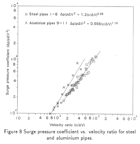 The measured surge magnitude (Figure 7) agrees, to within 2.5 %, with that calculated from the measured wave celerity and steady state velocity using the standard Joukowski relationship of equation (7). Thus the magnitude of the pressure surge is independent of the pipe size, cross-section, material and method of constraint, and depends only on the wave celerity for a given ∆V. In Figure 8 the surge pressure coefficients for each pipe material fall into two distinct bands with the best fit power laws defined in the figure. For other pipe materials, similar power laws will be obtained.