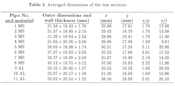 The experimental test rig is shown in Figure 2. The rectangular pipe test sections consisted of commercially available hot rolled mild steel pipes and aluminium extrusions. The steel pipes were divided into two sets, the pipes comprising a set having approximately the same nominal outside dimensions, but differing wall thickness. The aluminium pipes had a wider variation in their dimensions. A number of measurements, to within 0.01 mm, were taken of the outside dimensions and wall thickness of each pipe. These were averaged and are tabulated in Table 2. The fillet radii of the pipes were of the same order of magnitude as the wall thickness.