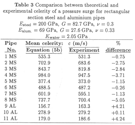 Sayers [4] further extended the work of Thorley & Guymer to include the effect of Poisson's ratio on the stretch of the pipe walls. Experimental pressure surge celerities were determined for square section steel pipes in the range