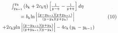 If y = yk (or y = yk-1), the integrals have to be evaluated in the Cauchy principle value sense; it can be shown that the factor y - yk(or y - yk-1, as appropriate) can then simply be omitted from equation (10), or replaced by a constant such as h or s to ensure that the arguments of the logarithmic terms remain non-dimensional.