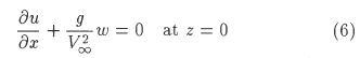The trailing vortex sheet and its image satisfy equation (6), the linearized free surface boundary condition, exactly, because both the axial velocity component u and the vertical velocity component w induced by the two sheets are zero everywhere on z = 0. It can therefore be consluded that the wave-making velocity potential associated with the trailing vortex sheet is exactly zero, and hence that wave-making effects are introduced only via the two-dimensional calculation procedure for determining the section lift characteristics.