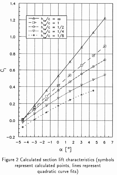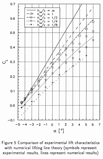 The correction factor for a 5.11 aspect ratio rectangular flat plate as calculated by means of Prandtl's lifting line theory was found to be equal to 0.6909. The experimental lift curves are compared in Figure 3 with the calculated two-dimensional results multiplied by this correction factor. For hte/c - 1, the experimental values are underestimated at small angles of attack (up to about 1o), but for larger angles the experimental values are overestimated. The reason for this dualistic behaviour is that there is a modest discontinuity in the slope of the measured lift curve at about α = 1, which can probably be ascribed to leading-edge separation of the long bubble type as described by Hoerner & Borst.[13] The potential flow theory used to calculate the section lift coefficients of course does not make provision for separated flow. The same comments apply in principle for the comparison at hte/c = 1/2. For hte/c = 1/4 and 1/8, correspondence between theory and experiment is poor: the theory under-estimates the lift by a considerable margin.