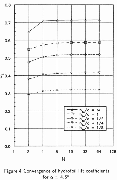of 4.3, depth of submergence of the trailing edge hteequal to 1/8, 1/4, 1/2, and 1 times chord length, and angles of attack ranging from -4.5° to 6°, corresponding to the towing test conditions. The lift curve for infinite submergence was also calculated. In order to ascertain whether the results were independent of panel size, the number of panels was varied from 23 (8 panels) to 29 (512 panels) for every case. The typical convergence behaviour of the section lift coefficient as function of the number of panels is illustrated in Figure 1 for α= 4.5°. It took approximately 6 min of CPU time to calculate one data point for 512 panels.