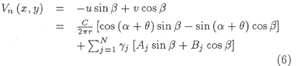 where Aj and Bj are quantities that depend only on the geometry of the blades and the cascade and can be calculated explicitly at any field point (x, y). Thus the only unknowns involved in the flow velocities are the vortex strengths γj in the nodes.