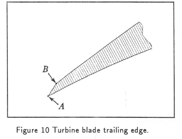 The trailing edge of the torque converter turbine blade is shown in Figure 10. The shape of this trailing edge creates a problem with the application of the Kutta condition. To simply apply the condition as detailed above would mean the specification of an outlet flow angle which is clearly larger than wat could realistically be expected from the cascade. Also, if the upper trailing edge corner B is not treated in a special way, inviscid flow theory would predict an infinite flow velocity around this corner. Different solutions to this problem, in the form of slight modifications to the blade profile, were investigated.