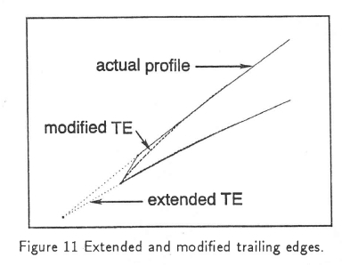 The trailing edge was adjusted such that the radial angle of the trailing edge bisector equalled this estimated outlet flow angle. The modification used two arcs, which joined the upper and lower curves of the profile surfaces smoothly and met in a sharp, tip with a bisector at the required angle (see Figure 13). Care was taken to keep the extension as short as possible to avoid inaccuracies. The Kutta condition was then applied to the adjusted blade trailing edge.