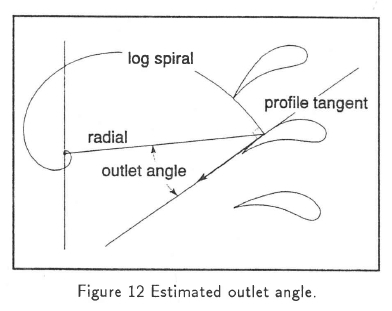 Dixon [12] describes a geometrical method for the estimation of the outlet flow angle of a linear cascade. This method may be modified for application to a radial cascade using a logarithmic spiral instead of Dixon's straight line, as illustrated in Figure 12. The logarithmic spiral connects the trailing edge of one profile with the suction surface of the next, intersecting the latter orthogonally. Only one such logarithmic spiral exists. Applied to the torque converter cascade, this method yielded a radial outlet flow angle of 29.59°.