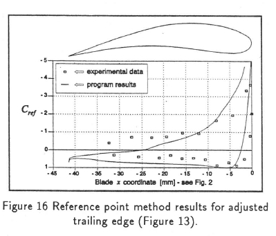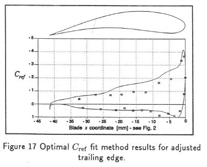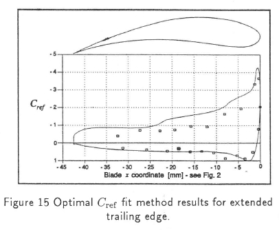 Since the extended trailing edge in Figure 11 and the adjusted trailing edge in Figure 13 yielded the most realistic results, only these will be discussed. The results for these blades are summarized in Table 2 and in Figures 14 to 17. The meaning of the table entries and the figure captions will shortly become clear.