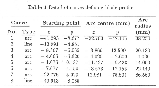 The calculated distribution of Cref around the profile may now be compared to that obtained experimentally. To quantify this comparison the means of the absolute deviations between experimental Cref 's and their calculated equivalents is used. This parameter is referred to as the MAD (mean absolute deviation) measure of fit. The Crefdistribution can also be integrated over the radial projection of the profile. By incorporating into this integral multiplication by the distance of every incremental area from the cascade centre, a measure of the moment around the cascade centre (or torque) generated by a single blade, is obtained. This moment coefficient is denoted by Cmom and may be calculated from the experimental and the panel method predicted Crefdistributions, and the results can be compared in further assessment of the accuracy of the analysis. The torque output of the turbine could also be measured experimentally and compared to an output torque calculated from the theoretical moment coefficient.