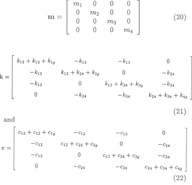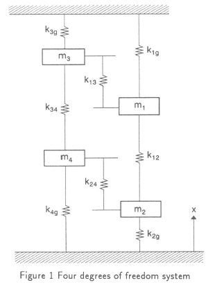 To investigate the feasibility of modal analysis with natural excitation using the time series approach, the simple four degrees of freedom system depicted in Figure 1 was considered. The system matrices can easily be shown to be