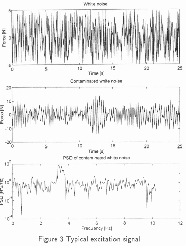 Because random excitation of industrial structures will never be ideally white, uncorrelated white noise signals were generated and then contaminated by bandlimited white noise signals superimposed on the original signals. For this investigation a band of 3,1 to 3,7 Hz was considered. A typical example of such a contaminated signal is shown in Figure 3.