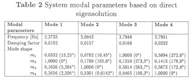 Using the system characteristics of Table 1, and solving for the eigenvalues and eigenvectors of the state matrix A, the modal parameters of the system are shown in Table 2. Two important features of the system under consideration are clear from this table. Firstly, the modes are complex. This is clear from the phase angles which differ significantly from the 0° and 180° found for real modes. This was done intentionally to simulate the effects of non-proportional damping which is typical of most industrial structures. Secondly, modes 3 and 4 are very closely spaced to resemble a phenomenon which is often observed on almost symmetrical structures. This was done to investigate the ability of the analysis method to distinguish between these modes.