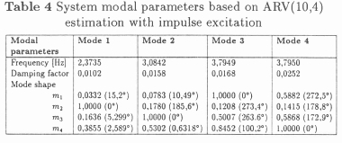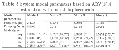 In the first investigation the system was perturbed by specifying initial displacements of 10 mm, 5 mm, 0 mm and 10 mm on masses 1 to 4, respectively. A modal analysis was then performed and based on the response data only and assuming an ARV(10,4) model, the system modal parameters were estimated as shown in Table 3. Very good correlation with the direct solution of the eigenproblem (Table 2) was found on all four modes.