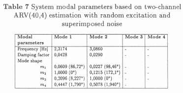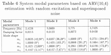 From Table 6 it follows that, while it is still possible to obtain quite reasonable estimates of the natural frequencies and mode shapes, all the damping estimates are now unreliable.
