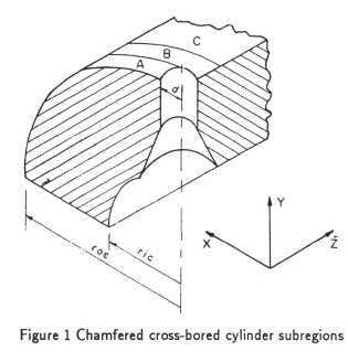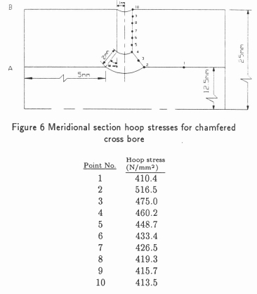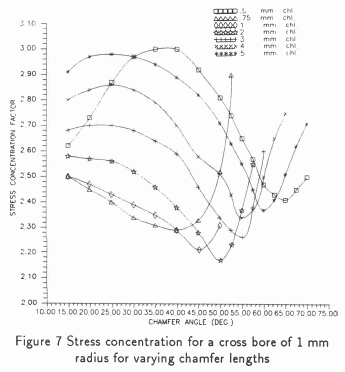 (c) Cross bores of increasing chamfer angle and fixed chamfer length were analysed for hoop stresses and stress concentration factor.