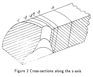 For reasons explained in (b), the 1 mm radius cross bore with a 2 mm long chamfer showed minimum stress concentration factor. The stress profiles discussed refer to the same cylinder analysed for the stress concentration factors. The chamfer angle was progressively increased from 15° to 57.5°. Curves 1 to 6 referred to in Figures 3 to 5 correspond to the cross sections 1 to 6 cut out in Figure 2. The corresponding hoop stresses on the loaded nodes of the main cylinder bore and the cross bore are discussed.