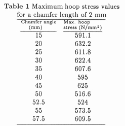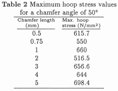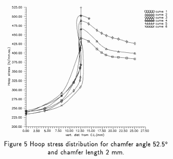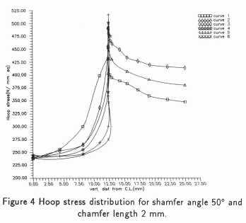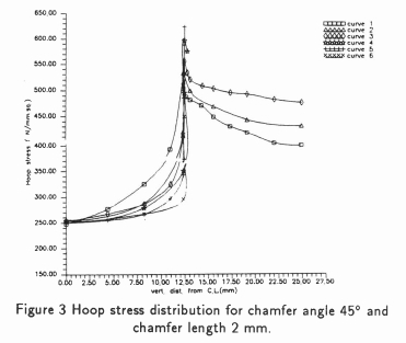 Generally, only the peak stress for each curve varies from geometry to geometry but the patterns are very similar. Increasing the chamfer angle, for a fixed chamfer length, shifts the geometric discontinuity to the left but this is hard to notice from the hoop stress profiles in Figures 3 to 5. Tables 1 and 2 summarize the maximum hoop stresses for the different geometries. These maxima were observed to occur at the chamfer to main bore intersection in the longitudinal section. These maxima values are of significance since an optimum geometry that minimizes the maximum hoop stress is normally selected in design.