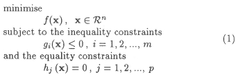 Here x = (x1, x2,..., xn) is called the vector of design variables, f(x) the objective or cost function and gi(x) and hj(x) the corresponding constraint functions.