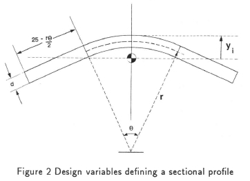 where Mi = Fli is the maximum bending moment in section i(see Figure 1) and yi is the maximum distance from the neutral axis through the centroid of the cross-section (see Figure 2). The effect of the curvature of the neutral axis is at most 5% and is therefore not taken into account. Since yiand Ii are clearly both functions of the design variables (di,ri;θi), so is σi. Having specified values for the set of design variables, x = (di, ri,θi) i = 1, 2, 3; the values of the maximum sectional stresses σi in each section imay be determined by using equation (2). This now enables the computation of an appropriate cost or objective function f(x).
