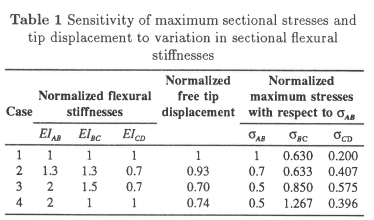 Several analyses were performed where the cross-sectional profiles of the different sections, AB, BC and CD, were varied to investigate the sensitivity of the global stiffness and the corresponding maximum tensile stresses σAB, σBC and σCD to different sizes and combinations of sectional profiles. These variations result in corresponding changes in the flexural stiffnesses of the different sections. It is found that a 30% increase in EIAB and EIBC, the flexural stiffnesses of sections AB and BC, respectively, together with a 30% decrease in EICD, the stiffness of section CD, resulted in a 30% decrease in the maximum stress σAB in the critical section AB, whilst the global stiffness only decreased by 7%. The results of the different analyses that were performed are listed in Table 1. These results, normalized relative to case 1, which corresponds to the existing design, indicate that it would indeed be possible to achieve a significant improvement of the design by lessening Icd and increasing Iab- This implies that an optimum design exists which minimizes the stress subject to satisfying the prescribed free tip displacement.