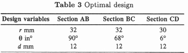 Note that in this particular description of the sectional profile, in terms of the design variables (di, ri,θi), that the greater the angle θi, the higher the value of second moment of area Ii for the particular section of interest and vice versa. The existing and optimal designs are listed in Tables 2 and 3, respectively. From a comparison it is clear that there is a dramatic difference between the dimensions of sections AB and CD for the standard and optimal designs. Note also that the thickness d of the optimal design has increased, which is indicative of a more expensive design.