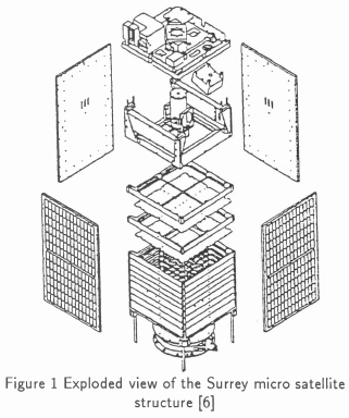 UoSAT-1 and 2 both used a rather conventional structure - a framework 'skeleton' onto which modules containing the various electronic subsystems and payloads were mounted. However, the need to accommodate a variety of payload customers within a standard launcher envelope, coupled with increased demands on packing density, economy of manufacture and ease of fabrication, led to the development of a modular design of a multi-mission micro satellite platform. This structure is based around a series of module trays that house the electronic circuits and themselves form the mechanical structure, onto which solar arrays are mounted as seen in Figure 1.[6]