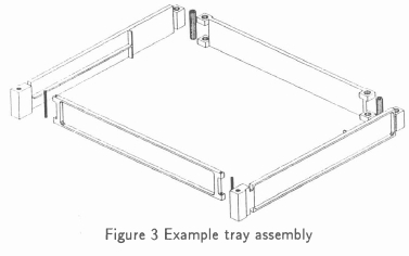 Each of the 11 trays houses particular electronic and mechanical components. A typical tray consists of 4 sides, 2 support ribs, and a printed circuit board, and forms one subassembly. Figure 3 shows an exploded view of a tray without board and support ribs. The boards are attached to the trays by screws on all sides. The two ribs reach from one side of the tray to the opposite. They support the board in the middle to increase its stiffness. The tray sides interlock with tenon joints. Pins fix the joints after assembly. Solid models of the tray sides were constructed in the CAD system during design to clarify the joint concept, ensure that sufficient material was provided where needed and to confirm assembly sequences. The Aluminium structure consisting of top plate, trays, base plate, and Payload Adapter Assembly weighs approximately 15 kg. This is 25% of the satellite's total mass.