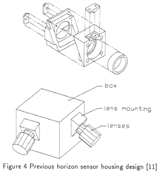 The assembly discussed above turned out to be too difficult to manufacture, weighed too much, was too large, and the single parts were difficult to assemble. The sensor housing was therefore redesigned, to optimise the functionality, size, manufacturability, and assembly requirements. Figure 5 shows the redesigned horizon sensor housings without lenses and electronics, mounted on the top of the satellite.