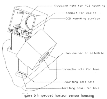 Two housings had to be made in the new design, versus one in the original. This leads, at first, to an increase in the part numbers, but this is well compensated for by the reduction of space used and easier manufacturing. Each horizon sensor's complete housing was milled out of one solid block, using a conventional vertical spindle milling machine. The PCB is totally enclosed by the housing in order to shelter it against radiation. The hollow foot enables the cables to run through it and provides a good heat conduction path. A lid closes the opening through which the PCB and the CCD sensor are mounted. It will be press fitted into the housing and glued on for the final assembly.