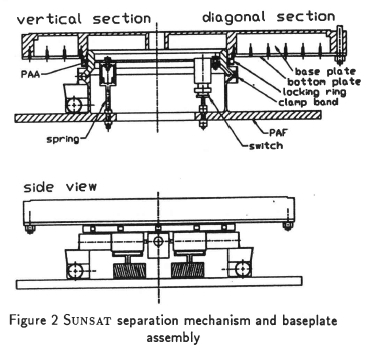 The Delta launcher interface separation mechanism and overall dimensions are supplied by the launcher company, McDonnell Douglas Aerospace (MDA).[6] The launcher company provides the PAF on the DELTA rocket, the clamp band and the separation springs, whilst the PAA is designed and supplied by the Sunsat team. The PAA has to be a separate component and not form part of the base of the satellite because the PAA has to be assembled with the PAF by installing the clamp band, separation springs and switches, before attaching the PAA to the baseplate. The integration of the PAA and PAF is impractical when the PAA is an integral part of the baseplate. The assembled PAA and PAF are attached to Sunsat before the PAF is integrated with the launch vehicle. Figure 2 shows the separation mechanism.