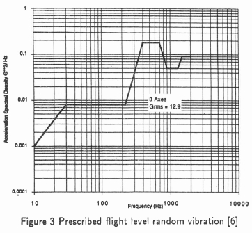 The protoflight random vibration tests are done by exciting the base of the satellite at the separation plane with an electromagnetic shaker in the three axis directions for 60 s per axis.[6] The duration of 60 s is an industry standard practice for the minimum duration of an acceptance test. The overall protoflight r.m.s. random acceleration is 18.2 g (flight levels in Figure 3 plus 3 dB). After the tests, the satellite is inspected and tested for functionality again.