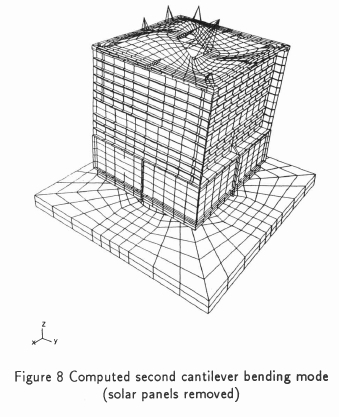The natural frequencies of the entire satellite were calculated and studied with this finite element model. The first two modes that the model gave are the lateral bending modes at 70.0 and 70.5 Hz. The third mode is the axial mode of the top plate of the satellite at 101 Hz. Figures 7 and 8 show the first two cantilevered bending modes as calculated with the finite element model. The solar panels are removed in the figures to display the main structure better.