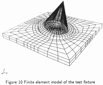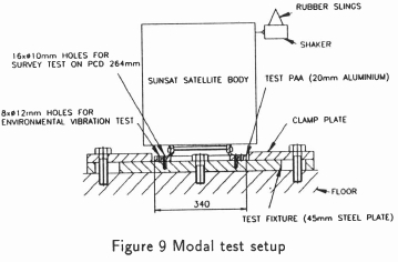 A special test PAA was designed that can be bolted to a heavy and rigid steel plate test fixture. The test PAA is identical to the flight PAA from the separation plane upwards. A finite element model of the modal test setup (test PAA and fixture plate) was created to check the rigidity of the test fixture. The mass and momente of inertia of the Sunsat satellite were modeled at one grid point at the centre of gravity and connected to the bottom ring of the test PAA with rigid elements. Figure 9 shows the modal test set-up. Figure 10 shows the finite element model of the test fixture in its first natural mode. The test fixture was designed so that the lowest natural frequency with Sunsat's mass and inertia, added at one point (centre of gravity) to the fixture, is at least 5 times higher than the same type of modal behavior (lateral bending mode) of the complete satellite model. In this way it is ensured that the addition of the test fixture finite element model to the finite element model of the satellite will not lower the natural frequencies significantly.