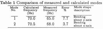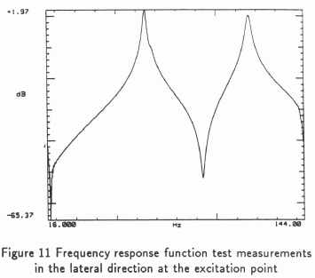 Table 1 shows the measured and calculated (before correlation adjustments) first two modes. A frequency response function plot of the test measurements in the lateral direction at the excitation point is provided in Figure 11. The plot shows a definite peak at the first bending mode of 65 Hz.