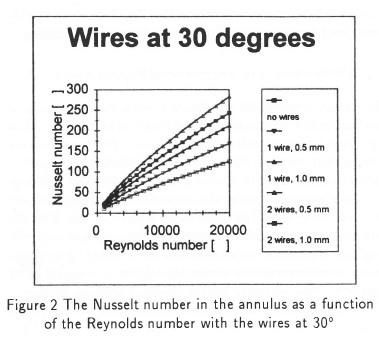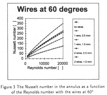 If Figure 2 is considered it can be concluded that the Nusselt number or convection coefficient in the annulus increases with an increase in the number of wires but does not necessarily always increase with wire thickness from 0.5 to 1.0 mm. The convection coefficient increases by a factor of 2.3 from the case of no wires to the case of two wires at 30 with a thickness of 0.5 mm. The same tendency is shown in Figure 3 where the Nusselt number in the annulus increases by 2.8 from the case of no wires to the case of two wires at 60 with a thickness of 0.5 mm. It therefore seems that higher convection coefficients occur for two wires of 0.5 mm at 60°, than at 30°.