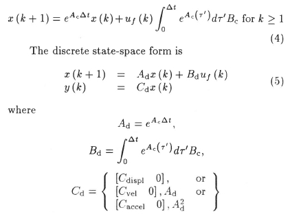The discrete-time state vector, x(k), may be obtained by evaluating equation (3) at equally spaced discrete intervals of time, i.e. t = (k + l)∆t and t0 = k∆t. Further, assuming that uf(τ) is constant over the interval k∆t < τ < (k + 1)∆t and has the value uf(k∆t), then equation (3) may be rewritten as7